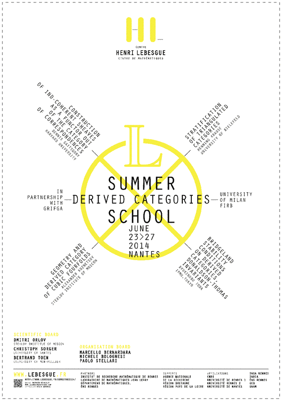 This event is co-financed by the Lebesgue Center and GRIFGA. We organize a Summer school aimed at Phd-Students and young researchers on some of the most interesting aspects of the theory of Derived Categories The school will be one week long and it will include 4 classes of 5 hours each.