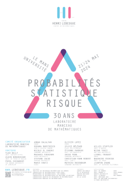 Le Laboratoire Manceau de Mathématiques organisera du 21 mai au 24 mai 2024 une conférence en probabilités, statistique et risque pour célébrer ses 30 ans. Elle comprendra deux journées « statistique et probabilités » (21-22 mai) et deux journées « risque » (23-24 mai). La deuxième semaine (27-31 mai) sera consacrée à l'école de printemps des projet de l'Agence Nationale de la recherche DREAMeS et EFFI. Ces deux semaines seront l'occasion pour les chercheurs du CHL et les chercheurs internationaux invités à cette occasion d'échanger sur leurs thématiques de recherche. Des informations complémentaires sont disponibles avec ce lien.